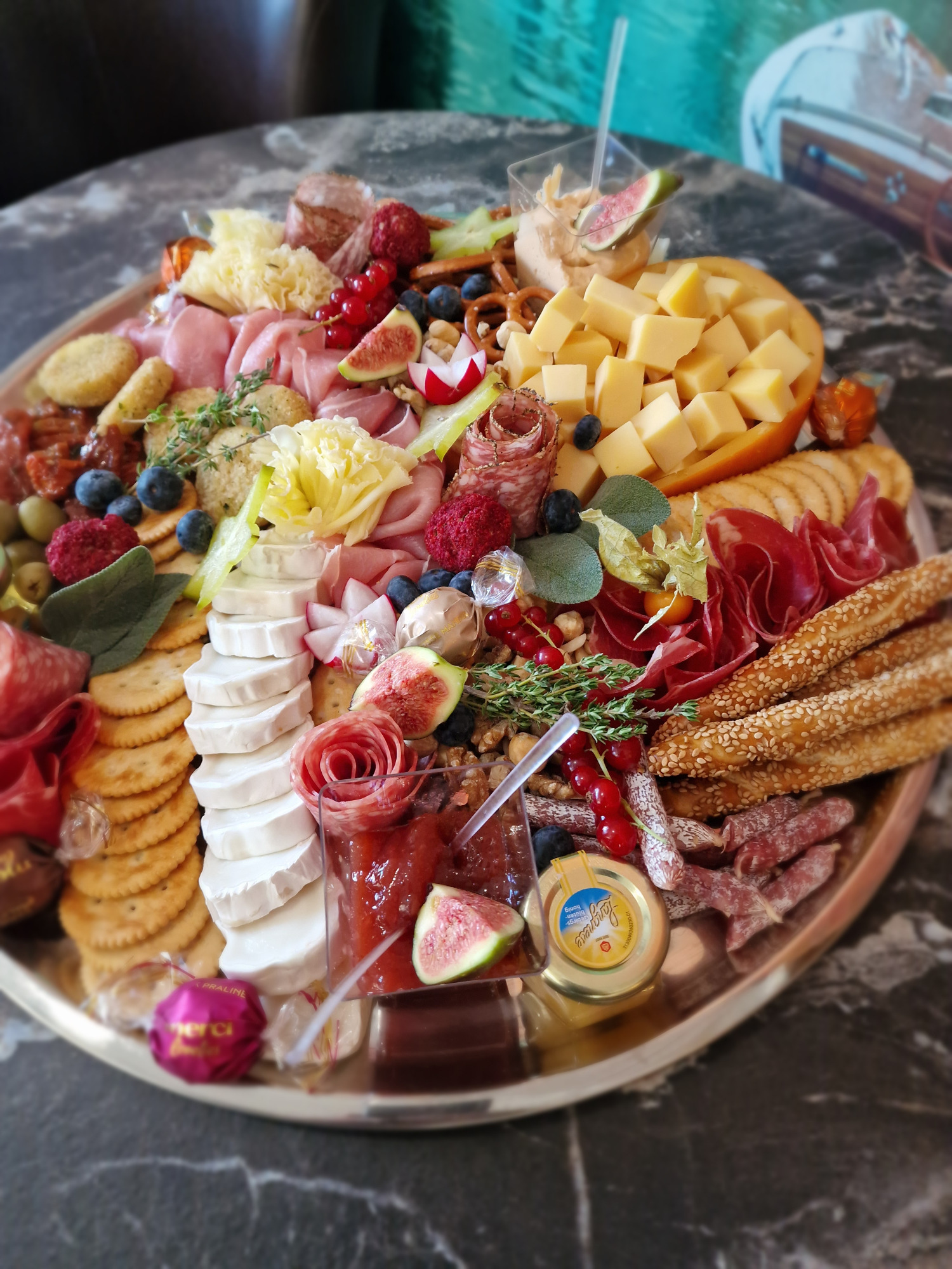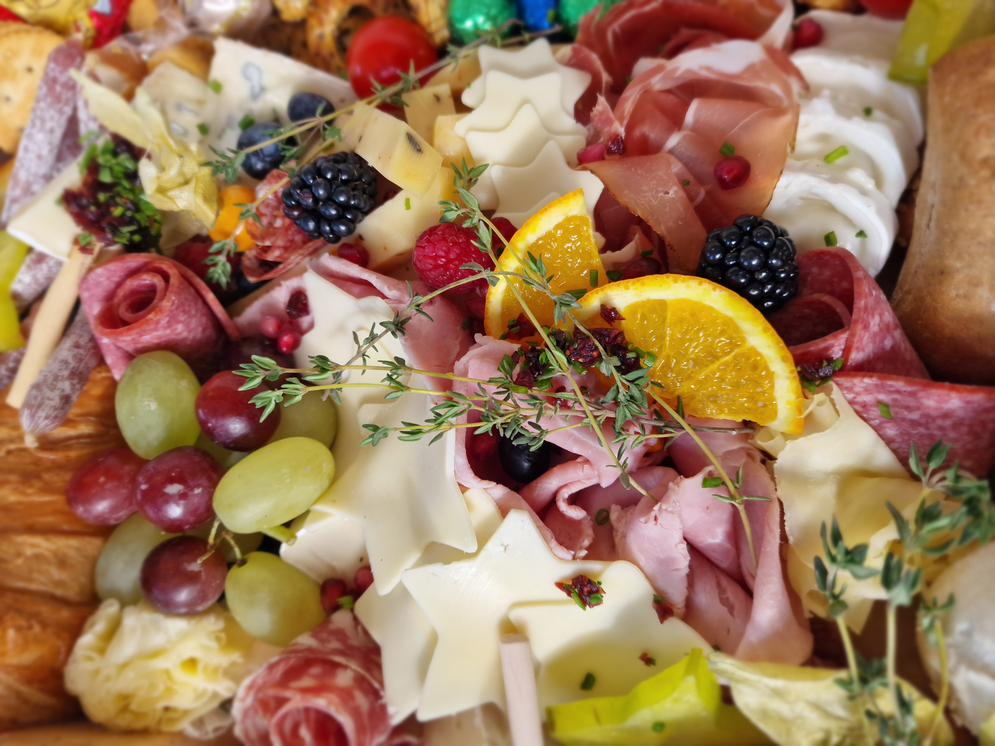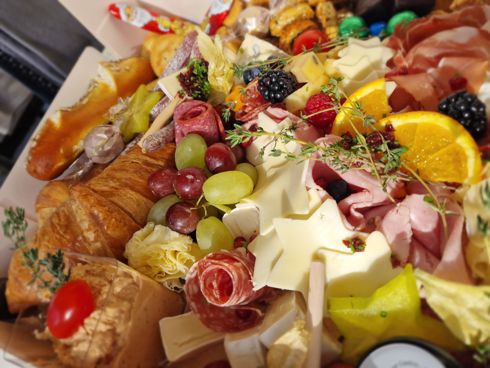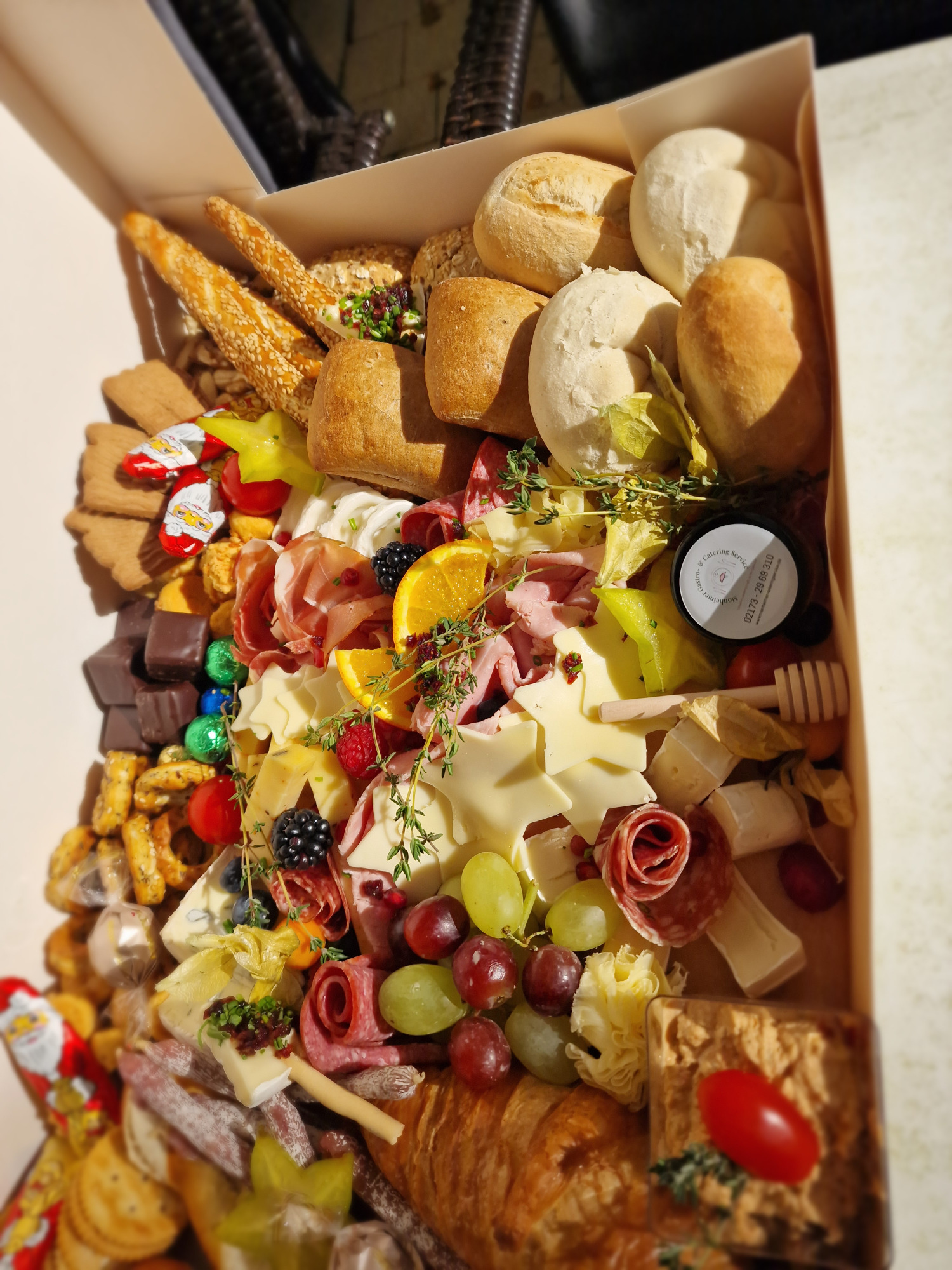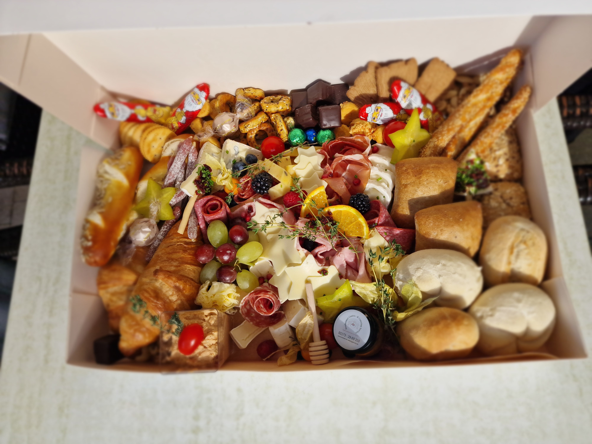 mit Aufschnitt, Käse, Rohkost, Marmeladen, Honig, Brötchenauswahl & Croissants